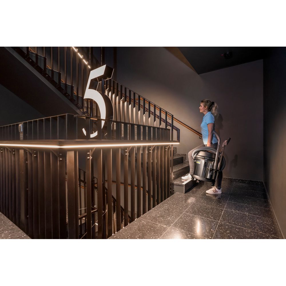 Le NT 27/1 Me est un aspirateur eau et poussières compact, maniable et convivial pour des applications professionnelles polyvalentes. Sa turbine lui confère une énorme puissance d'aspiration. Cet appareil est équipé d'un filtre cartouche. Pour éviter les débordements, un dispositif à flotteur mécanique coupe l'aspiration dès que l'on atteint le niveau maximum de remplissage de la cuve. Le système pratique à clips permet de changer les accessoires facilement et rapidement. Cinq roulettes pivotantes tournant en douceur garantissent une maniabilité et stabilité optimales. Le dessus de la turbine est aménagé avec un espace pratique pour les accessoires. Le NT 27/1 Me comporte également des porte-accessoires et un crochet pour ranger le câble électrique. Le guidon ergonomique autorise un transport aisé et commode de l'appareil avec tous ses accessoires. Le NT 27/1 Me est doté d'un bourrelet de protection circulaire qui protège l'appareil, ainsi que les murs, le matériel et le mobilier contre les dommages. La carrosserie en acier inox anti-corrosion de cet aspirateur industriel résiste aux acides et aux liquides alcalins pour une longue vie utile.