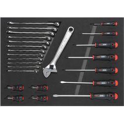 Servante série 41 nouvelle génération : 5 tiroirs (1 de 64 mm, 2 de 104 mm, 1 de 152 mm, 1 de 254 mm). Plus 20% de rangement en plus par rapport à notre servante standard, 2 grilles de rangement complémentaire sur les côtés, Plateau inox avec rebords, Bumpers pour protéger les carrosseries. SÛRE : Pour éviter un éventuel risque de basculement, la servante 416HZ est équipée d'un système unitaire d'ouverture des tiroirs. Dès lors qu'un tiroir est ouvert, le système anti basculement est effectif et les autres tiroirs sont verrouillés. 1 plateau en inox. Ouverture à 100 % des tiroirs. CONFORTABLE : Hauteur du poste de travail revue pour plus de confort. Grande surface de travail. 4 roues pivotantes de Ø 125 mm dont une freinée pour faciliter les déplacements d'un seul doigt. Poignée intégrée. COMPOSITION DE 135 OUTILS : Plateau n°1 : X 18 douilles 1/2” : 10-11-12-13-14-15-16- 17-18-19-20-21-22-23-24-27-30-32 mm. X 1 rallonge articulée 1/2”. X 1 cliquet 1/2". X 1 poignée coulissante ½". X 1 cardan ½". X 1 rallonge 1/2”. X 5 douilles 1/2” longues. X 15 douilles 1/4” : 3,5-4-4,5-5-5,5-6-7-8-9- 10-11-12-13-14-15 mm. X 1 cliquet 1/4”. X 1 cardan 1/4”. X 2 rallonges 1/4” : 50 et 100mm. X 1 rallonge 1/4” flexible 150mm. X 1 poignée coulissante 1/4”. X 1 tournevis porte douilles 1/4”. X 1 douille porte embout 1/4”. X 30 embouts. X 20 douilles tournevis ¼". X 5 douilles Torx® 1/4” : 4-5-6-7-8. Plateau n°2 : X 12 clés mixtes : 8-9-10-11-12-13-14-15-16- 17-18-19 mm. X 11 tournevis : 7 fente, 4 Phillips®. X 1 clé à molette. X 1 burin plat. Plateau n°3 : X 1 massette. X 1 marteau 32mm. X 1 pince multiprise. X 1 pince coupante. X 1 pince universelle. X 1 pince à becs droits. X 1 pince étau. X 9 clés 6 pans longues à tête sphérique. X 9 clés Torx® courtes. X 9 clés Résistorx courtes. X 5 chasse goupilles : 2,5-3,5-5-7-9 mm. X 1 pointeau. X 1 mesure courte 3 m. X 1 jeu de jauges d'épaisseur.