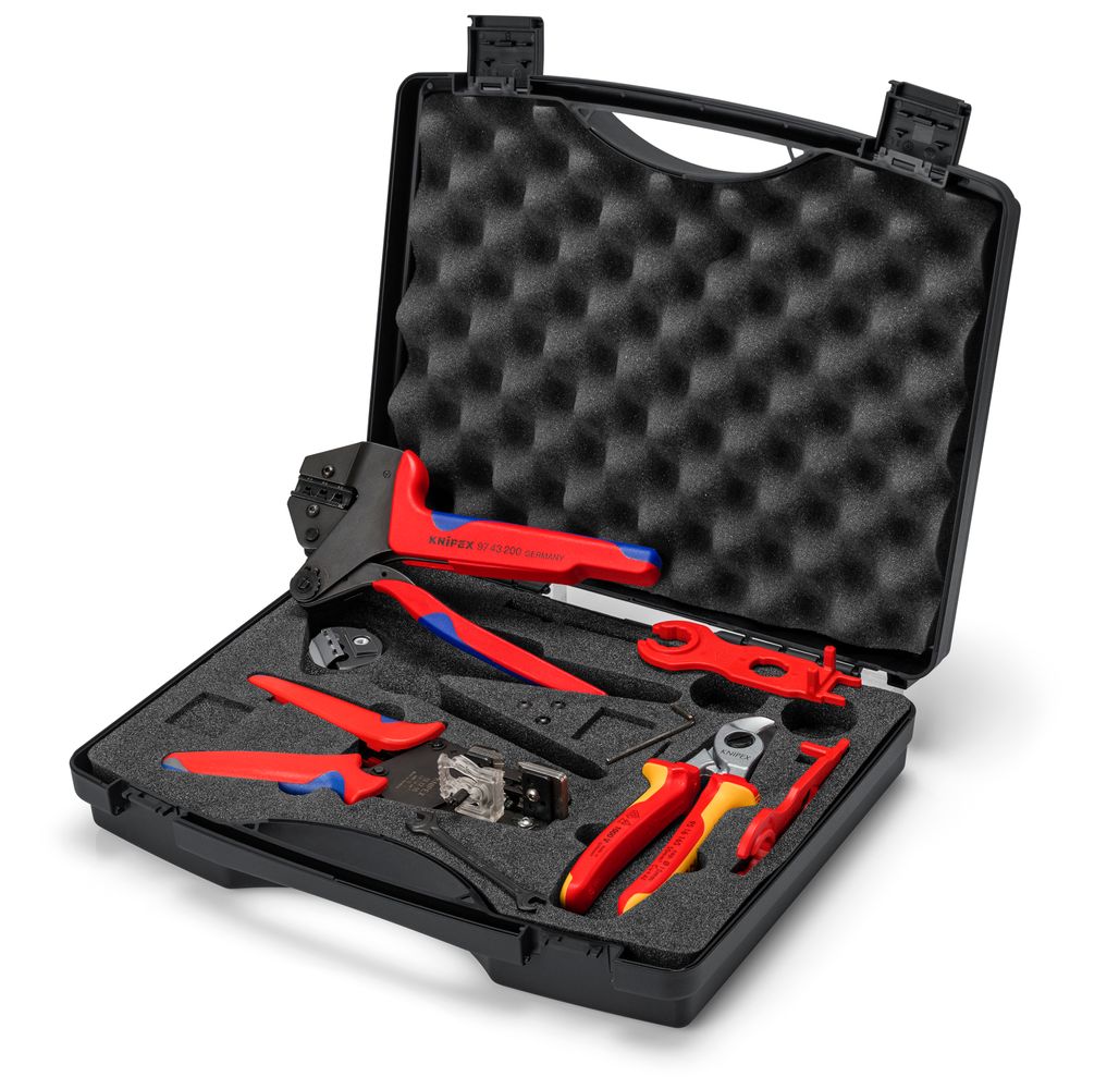 97 91 04 V01 Gereedschapskoffer voor fotovoltaïek met gereedschap voor de fotovoltaïek. Met krimp-systeemtang 97 43 200 A voor verwisselbare krimpprofielen; de krimpdruk is in de fabriek exact ingesteld (gekalibreerd). Met kabelschaar 95 16 165 voor Cu-kabels tot Ø 15 mm. Met montagegereedschap (binnenzeskantsleutel) om de krimpprofielen te vervangen Schuimrubberen voering met uitsparingen voor de gereedschappen, krimpprofielen en positioneerhulpen. Stootvaste kunststof koffer. Buitenmaat (B x H x D): 345 x 80 x 280 mm Met precisie afstriptang 12 12 11 met precisie geslepen messen voor kleinere afstripcapaciteiten 1,5 / 2,5 / 4,0 / 6,0 mm². Leveromvang: 1 x 12 12 11 KNIPEX Precisie afstriptang met precisie geslepen messen (1,5 – 6,0 mm²), 1 x 95 16 165 Knipex Kabelschaar (Ø 15 mm / 50 mm²), 1 x 97 43 200 A KNIPEX Krimp-systeemtang voor verwisselbare krimpprofielen, 1 x 97 49 66 KNIPEX Krimpprofiel voor solar connectors MC4 (Multi-Contact) 2,5/4/6 mm² (2,5 – 6,0 mm²), 1 x 97 49 66 1 KNIPEX Positioneerhulp voor 97 49 66 (solar connectors MC4), 1 x 97 49 66 2 KNIPEX Montagegereedschap-set voor solar connectors MC4 (Multi-Contact),