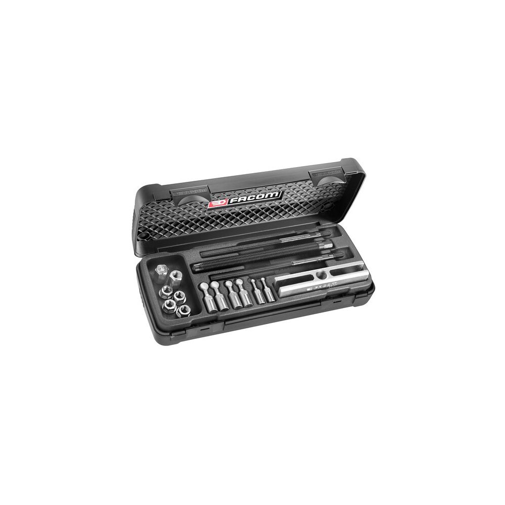 Bevat : - 3 paar verloopstukken: Ø 9 - 11 - 12,5 mm. - Trekstang U.53K1. Capaciteit: Ø 40 tot 110 mm. Voor ISO-rollagers: 6206 t/m 6211; 6303 t/m 6307; 6403 t/m 6404. Geleverd in een doos van kunststof BP.115 met inlay PL.71A.